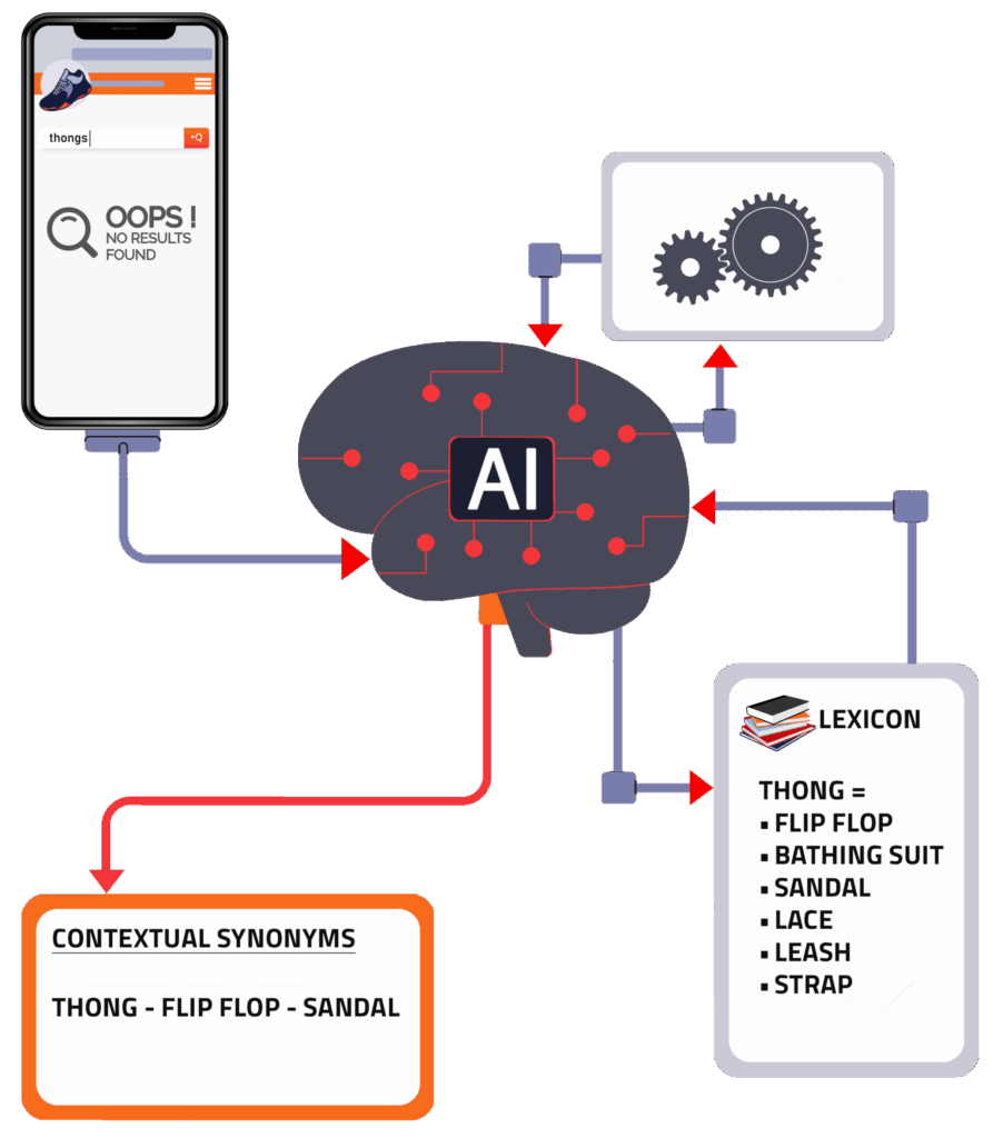 - Synonym application: Synonyms that pass the contextual relevance check are applied to the initial no-hit keyword. Future searches with this keyword will yield results based on the identified and verified synonym, ensuring a seamless and frustration-free user experience.