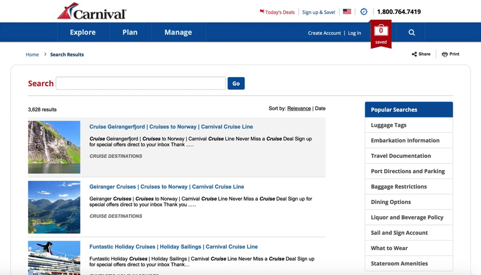 Carnival Cruise Line uses AddSearch to help their website visitors find answers to their questions. The search page also guides the users by providing a section of popular searches as well as frequently asked questions.