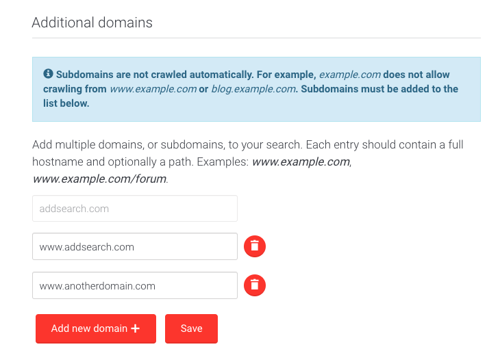 AddSearch allows for adding multiple domains to your account. You can add top-level domains (yourotherwebsite.com) and subdomains (subdomain.yoursite.com) for indexing on your account.