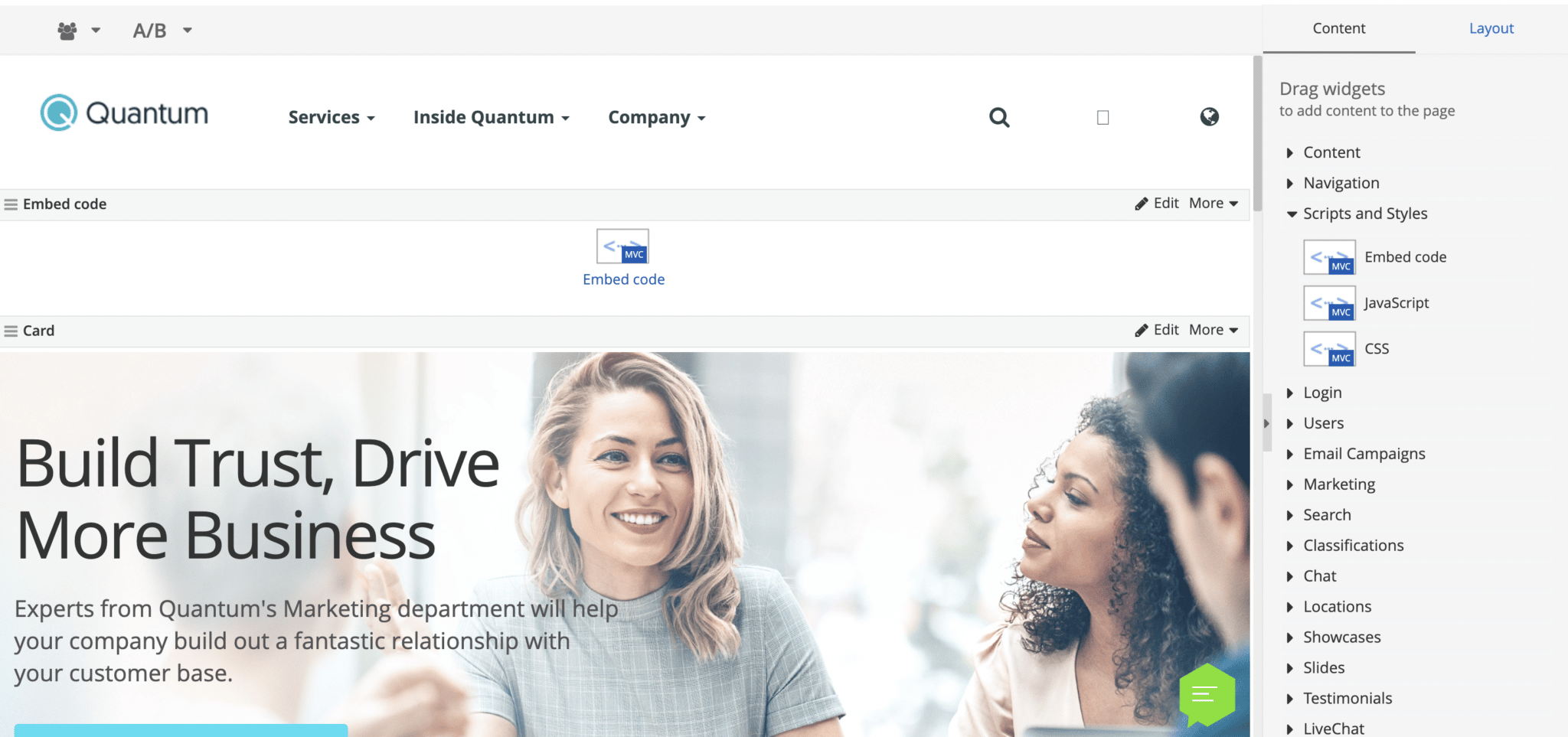 - Go to the “Page -> Edit Content” and choose “Embed Code” under scripts and styles, and drag and drop the embed code widget where you want the search to appear.