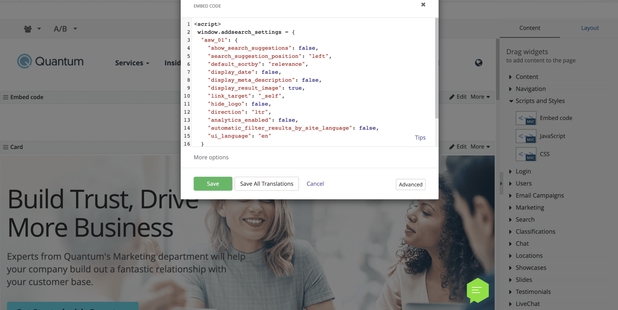 - Click “Embed Code” and paste the script you have created using the Search Designer tool and click save. Once the script is saved click publish.