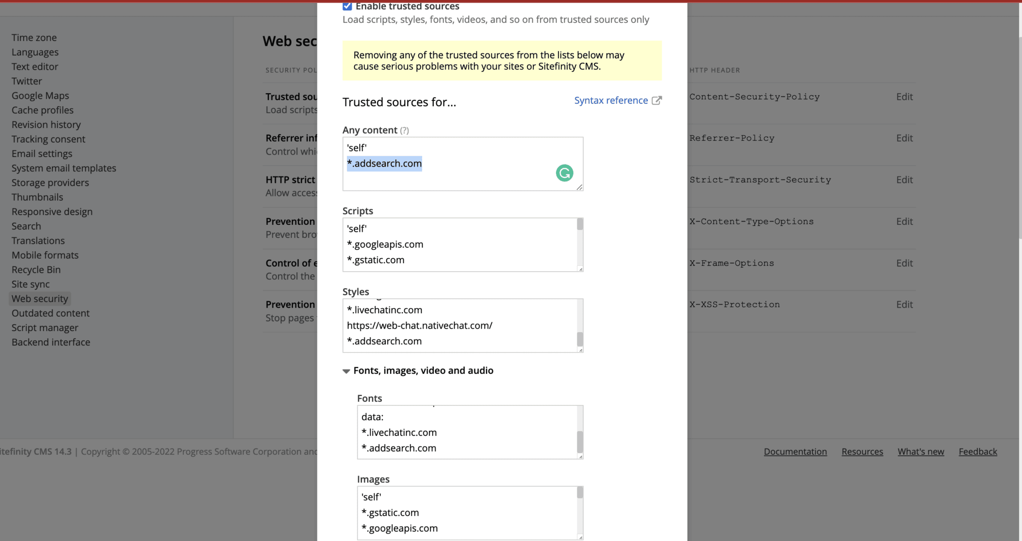 - Go to the “Administration->Settings->Web Security” and edit “Content-Security-Policy” under “Trusted Sources” section, and add “*.addsearch.com” to all sub-sections.