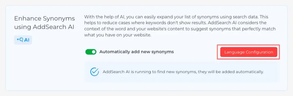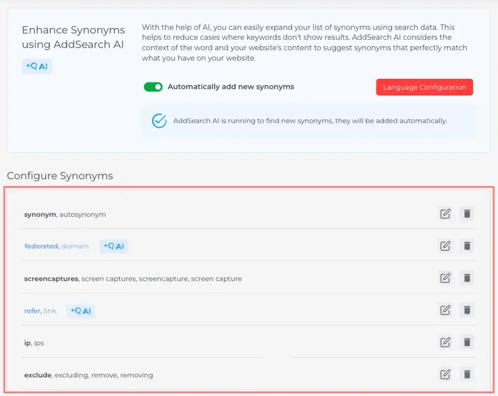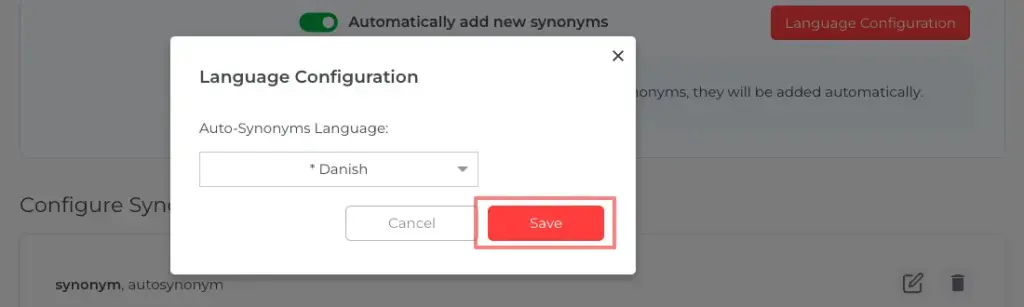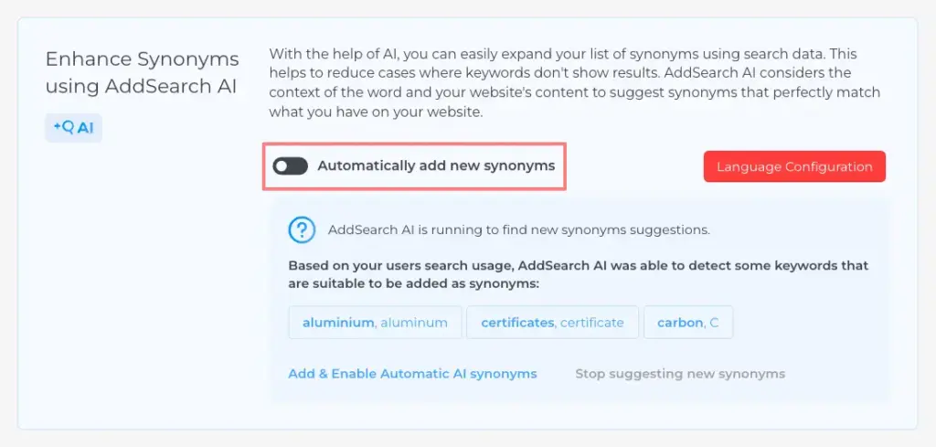 - Use Automatically add new synonyms toggle to enable Auto Synonyms