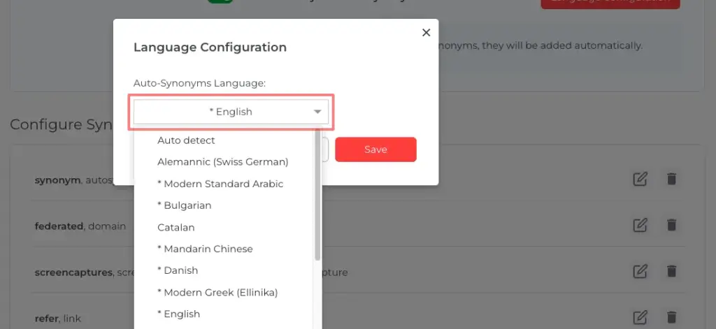 Please note that only one language can be supported at a time. The selected language is used to generate contextually relevant synonyms. To use multiple languages, you need to separate indices for each language.