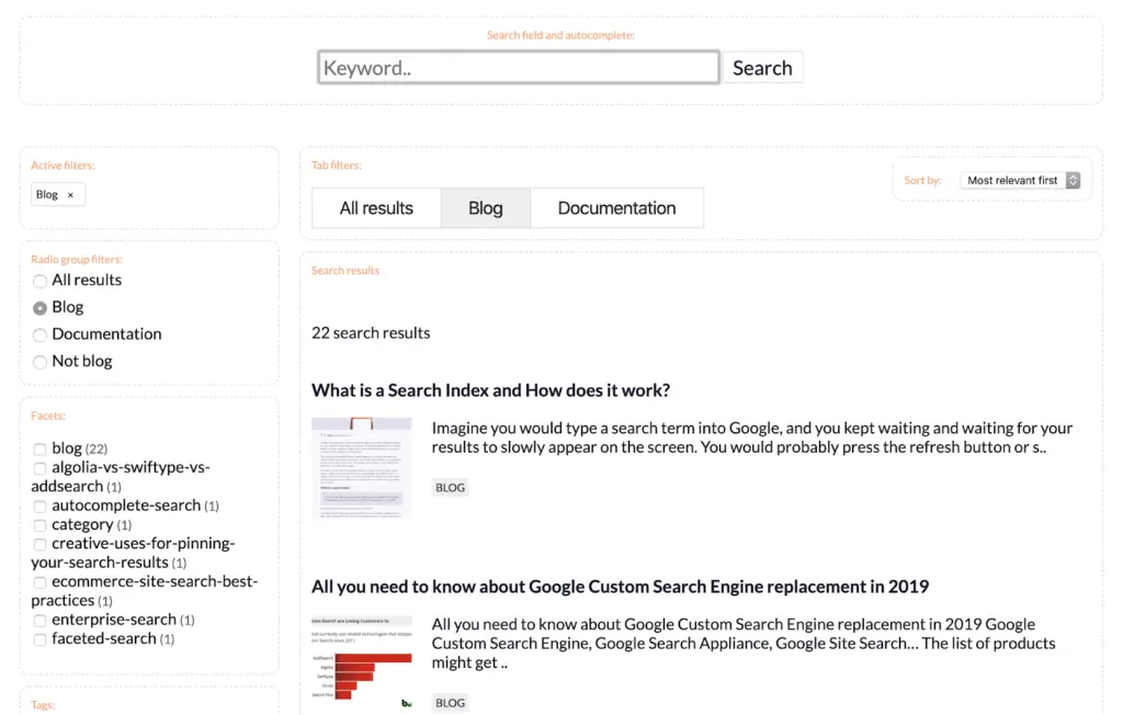 Filters provide your users with an easy way to navigate their results and find what they’re looking for. With AddSearch, search filters are available based on a number of variables. Filters can appear as tabs, dropdowns, switches, tags, and checkboxes in order to filter by facet, range, and custom fields.